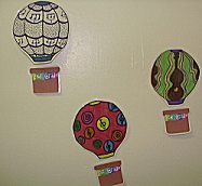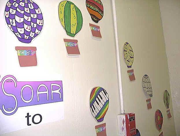 Soar into music with this bulletin board. The hot air balloons are just marker, paper and a boring Sunday afternoon's creativity. The baskets are brown construction paper with the name of each of my classes' names on them.